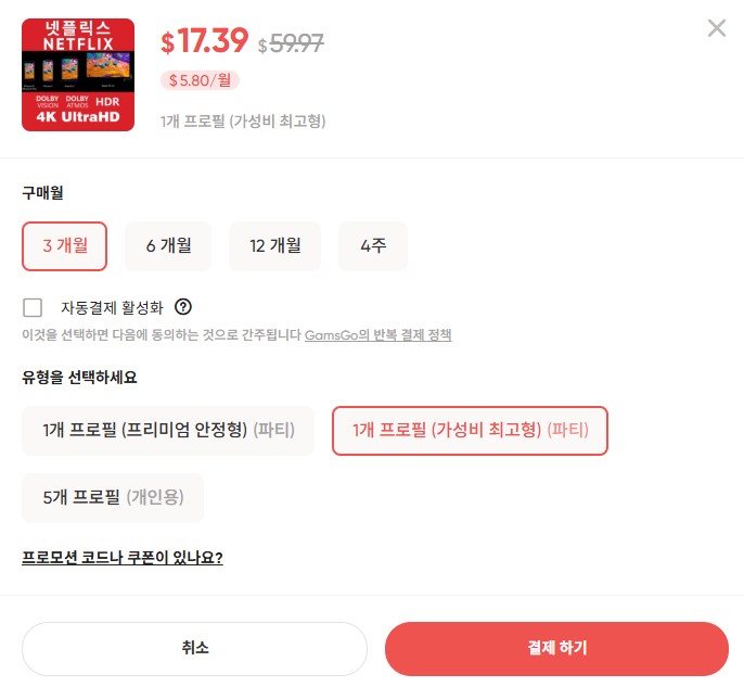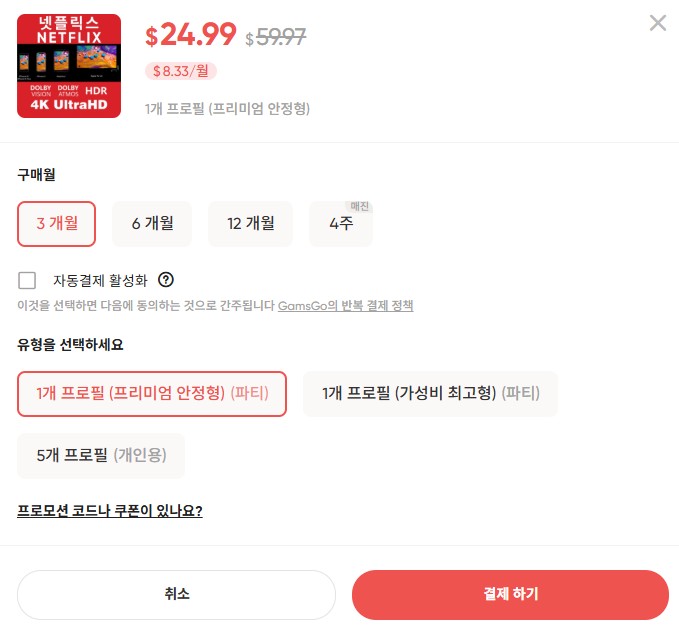 현재 겜스고 넷플릭스 서비스의 이용요금은 3개월 $17.39 ( 가성비 최고형 ) 또는 $24.99 ( 프리미엄 안정형 ) 입니다.