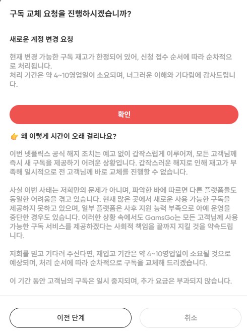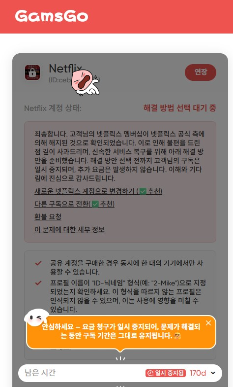 겜스고 GamsGo 이용자중 넷플릭스 공유 서비스를 이용하는 대부분이 현재 넷플릭스를 볼 수 없는 상태입니다.
