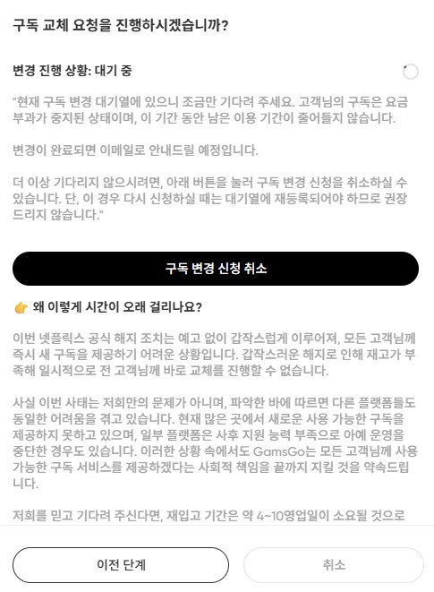 겜스고를 이용하던 수많은 넷플릭스 계정이 해지되었으니까 당장 공유받을 수 있는 계정이 부족한 것은 당연한 상황이겠죠?