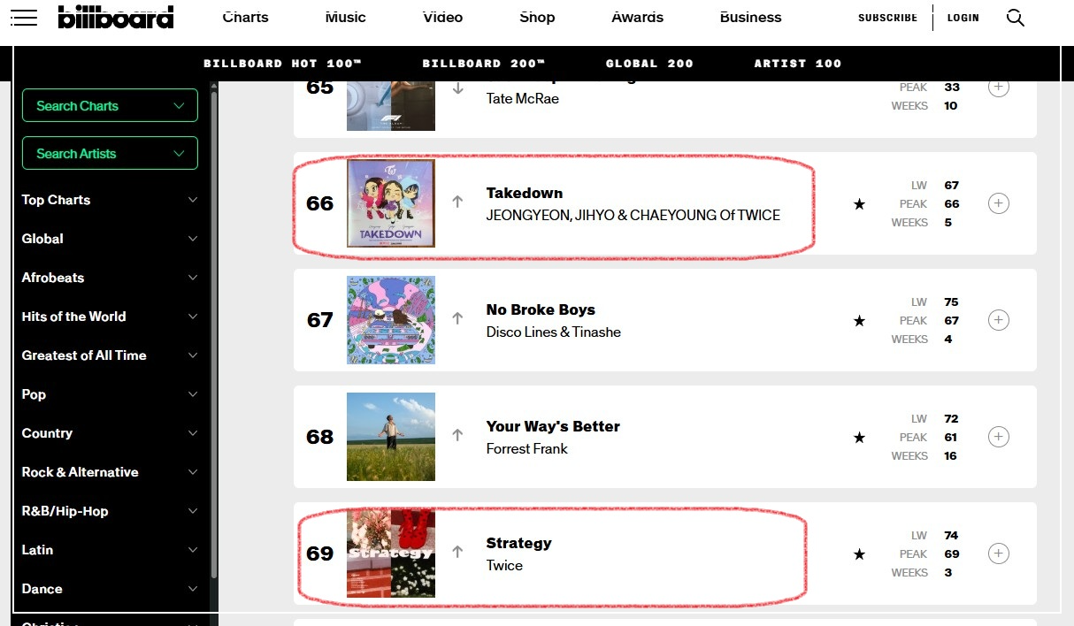 - 핫100: Takedown(정연·지효·채영), Strategy 모두 차트 인을 기록. Strategy는 커리어 하이를 경신했습니다. 트랙 두 곡이 동시기에 같은 메인 차트에서 발견되는 것은 트와이스 미국 인기가 팬덤 코어에서 대중 저변으로 확산 중임을 시사합니다.