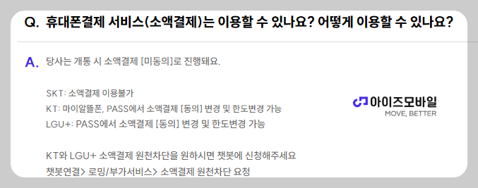 아이즈모바일은 소액결제 원천차단을 원하면 챗봇에게 신청하라고 안내하고 있습니다.