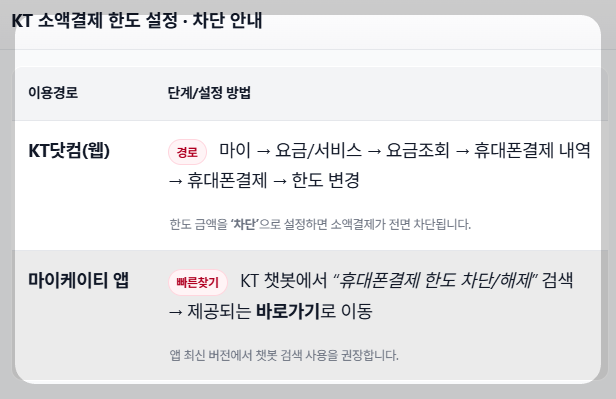 아래는 KT 이용자들의 소액결제 차단 방법입니다.