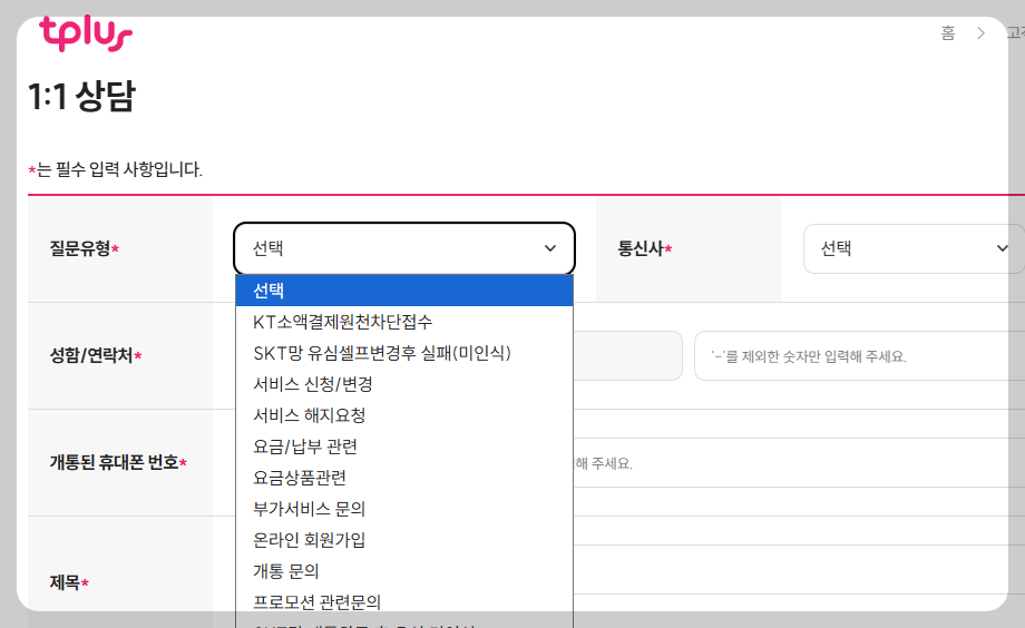 tplus모바일은 고객센터 1:1상담에서 kt 소액결제 원천차단 접수를 할 수 있습니다.