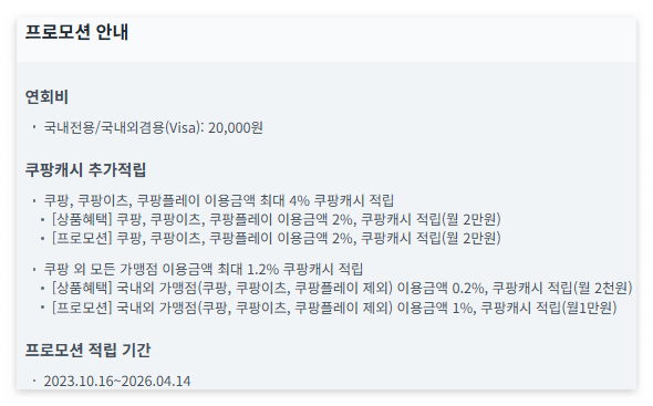 하지만, 쿠팡와우카드의 쿠팡 적립율은 원래 2% 이고 현재는 프로모션 추가적립 2% 가 적용되어서 4% 혜택을 누리고 있는 것인데 바로 그 "프로모션" 이 종료가 가까워지고 있습니다.