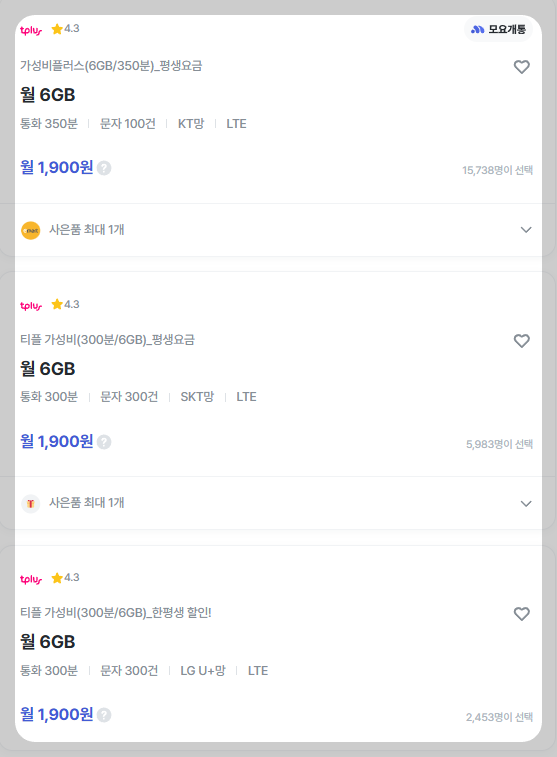 아래는 진정한 가성비 요금제입니다. 월 1,900원이면 6G 를 사용할 수 있습니다.