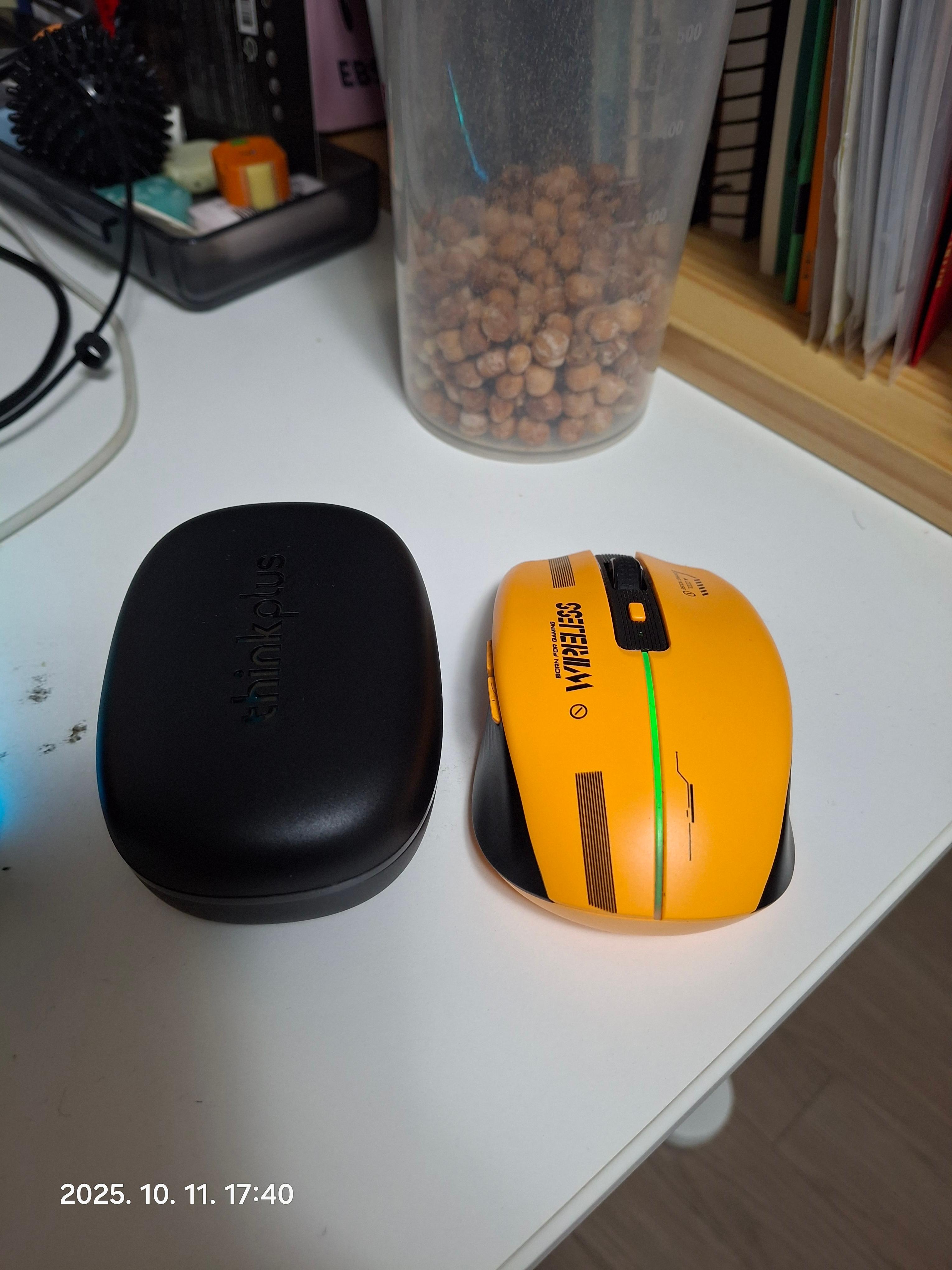 왼쪽이 LP75 이어폰 케이스입니다. 오른쪽은 무선마우스인데 미니사이즈 아니고 일반크기입니다.
