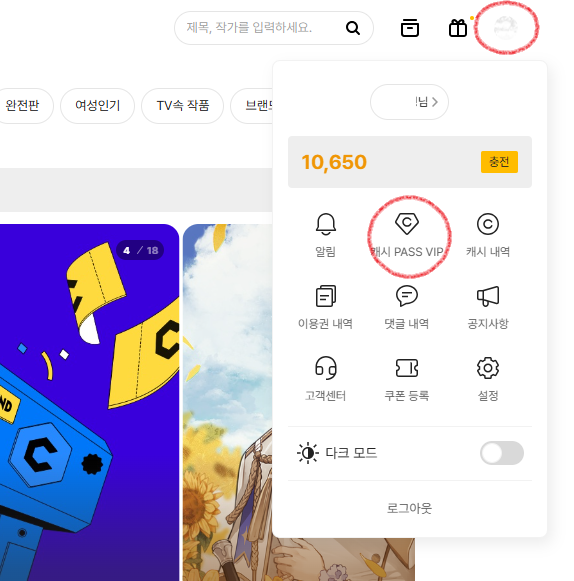 3. "캐시 PASS VIP" 를 눌러줍니다.