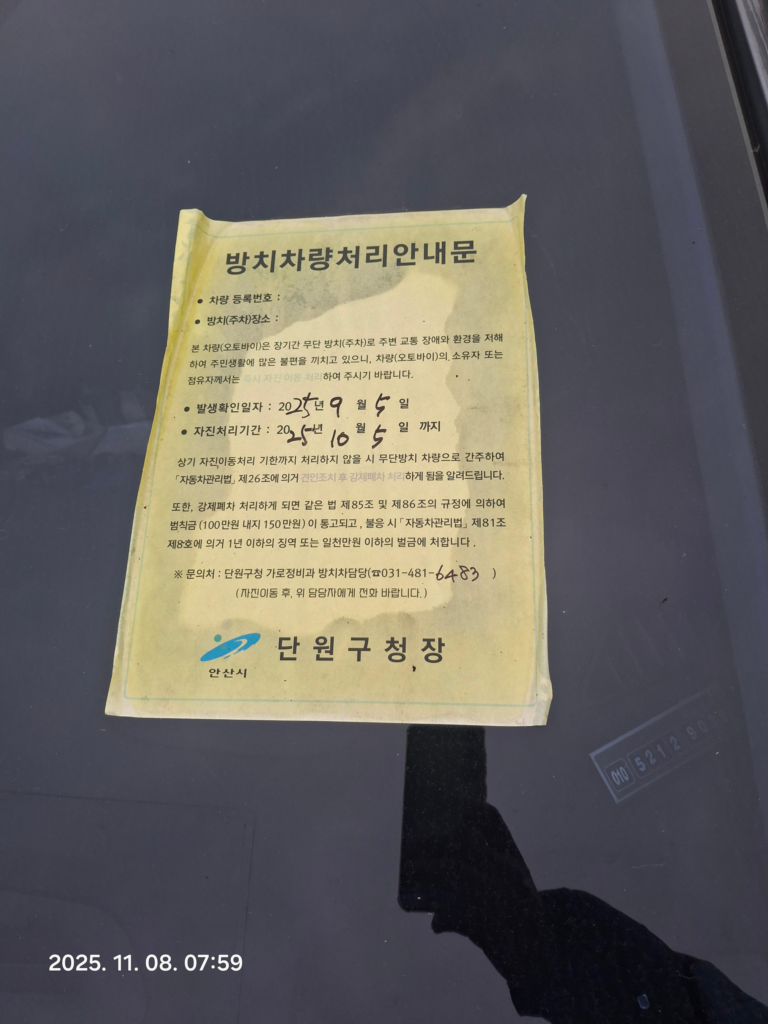 10월 5일까지 자진 처리 하지 않으면 견인후 강제폐차 한다는 안내문이죠.