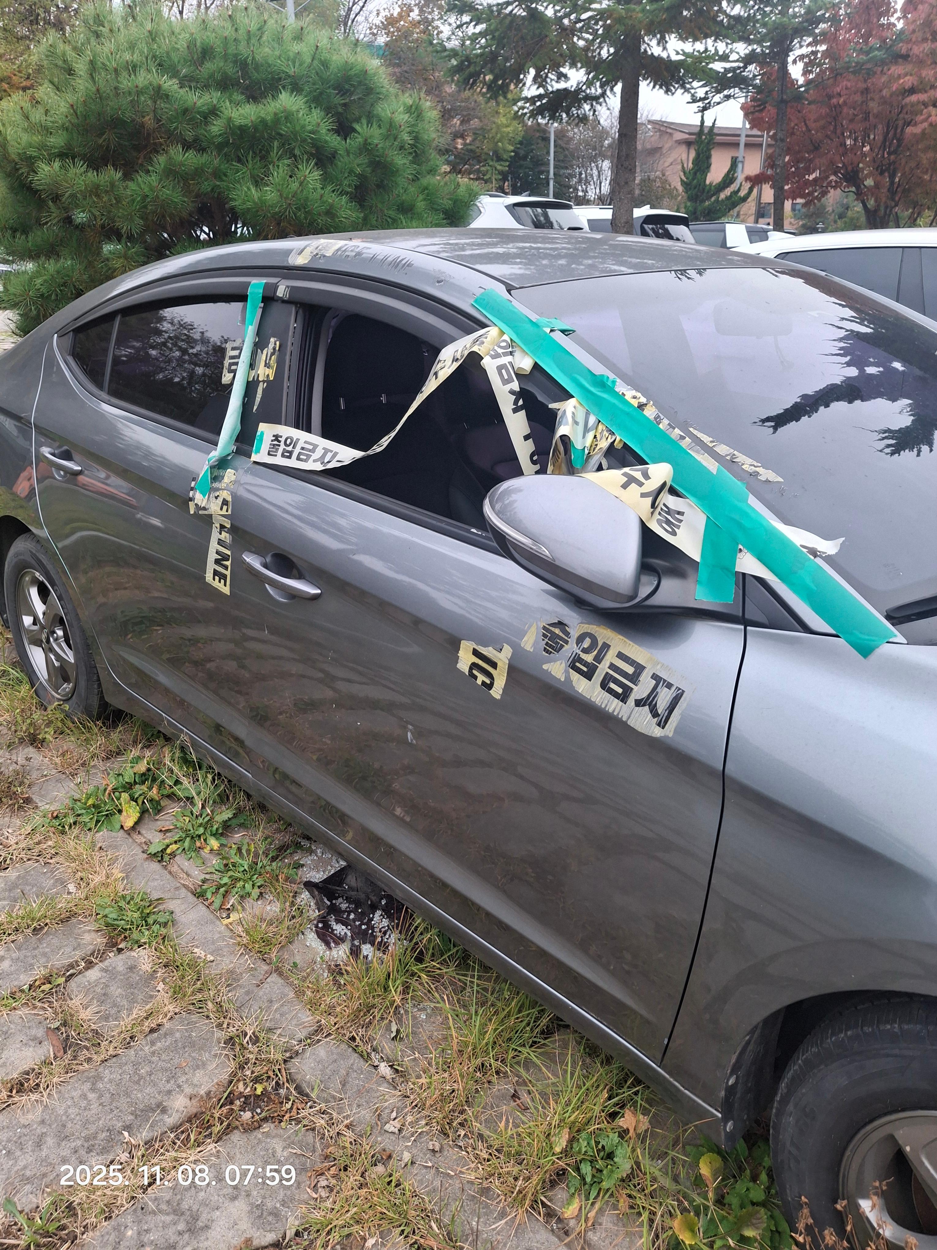 조수석 창문이 깨져있고 폴리스라인 스티커가 붙어 있습니다.