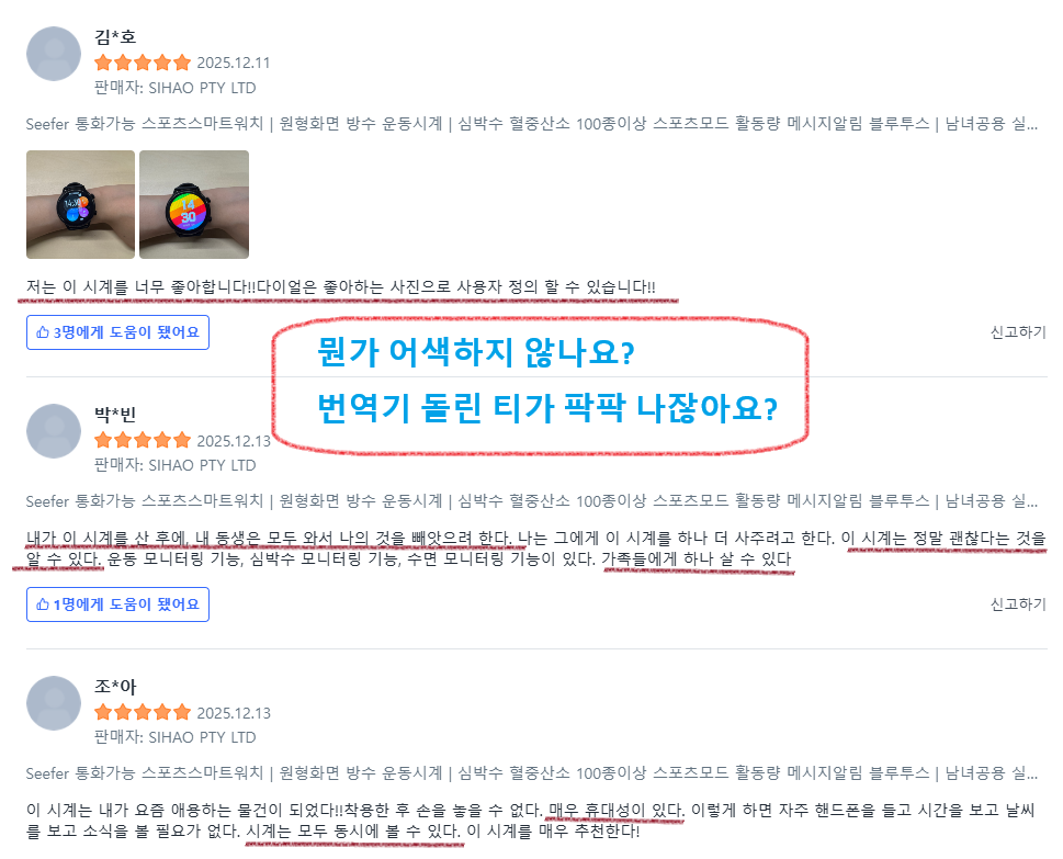요즘 들어서 쿠팡 상품들 중 판매자가 중국회사인 경우 이렇게 어색한 리뷰가 넘쳐나는 경우가 많습니다.
