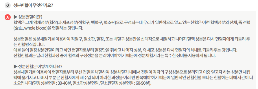 혈장헌혈,혈소판헌혈,다종헌혈 같은 성분헌혈은 헌혈 과정상 전혈과는 크게 다른 점이 있는데, 피를 뽑은 후 필요한 성분을 제외한 나머지 성분을 몸 안으로 다시 되돌려 준다는 점입니다. 그래서 전혈보다 시간이 더 오래 걸리지요.