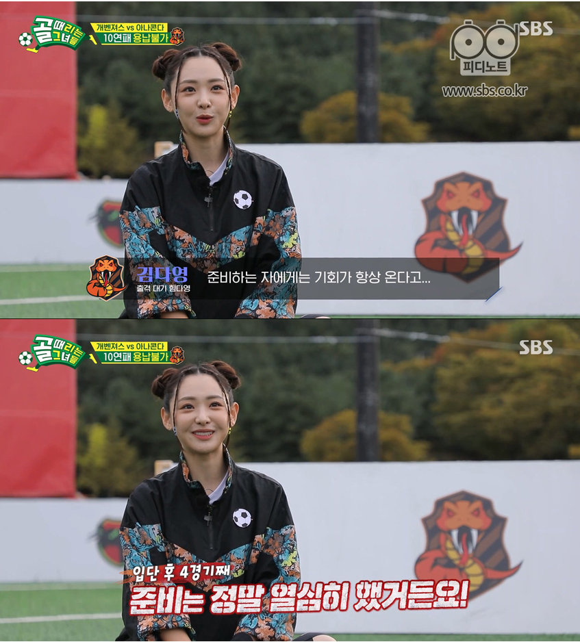 선배들의 실력에 밀려서 벤치에 있다가 , 경기에 기용되었는데 부상으로 또 벤치에 있게 되어서 아쉬움이 많겠지만 김다영 아나운서의 노력과 열정은 감춰지지 않으니 기죽지 말고 더 즐겁게 골때녀 해주었으면 하는 바람입니다.