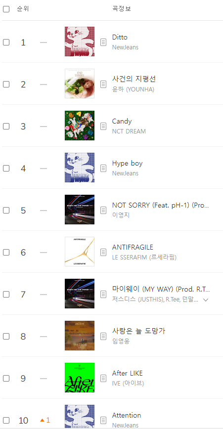 활동을 끝낸지도 한참 되어 가는 Hype boy 가 아직도 4위에 있고, Attention 도 10위에 머무르고 있으니 정말 대단한 성과라고 할 수 있습니다.
