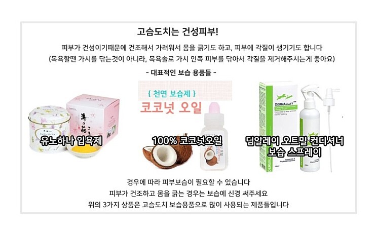 보습과 각질 예방에는 코코넛오일, 유노하나 를 추천드립니다.
