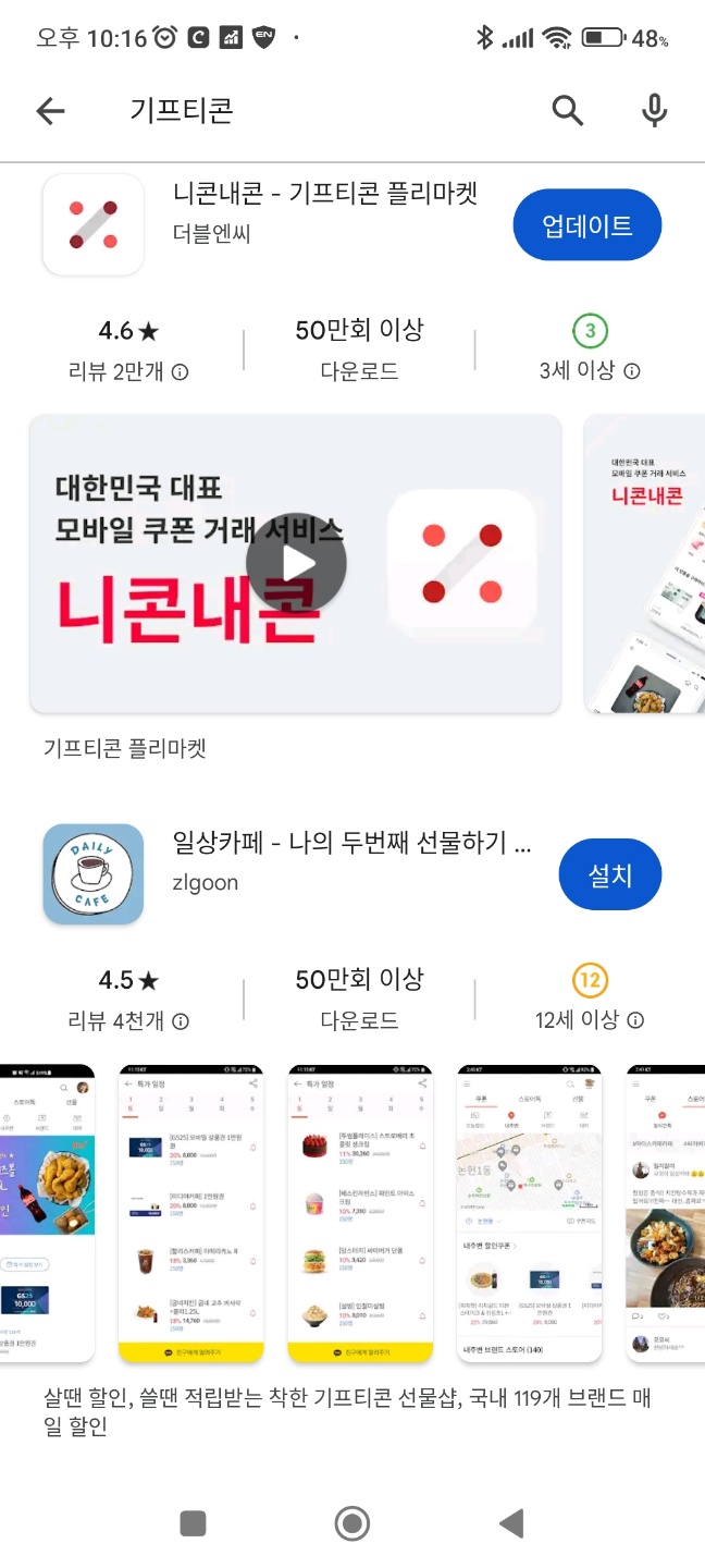 앱스토어에서 "기프티콘" 을 검색하면 니콘내콘, 일상카페, 기프티스타 등 여러개의 어플들이 보입니다.