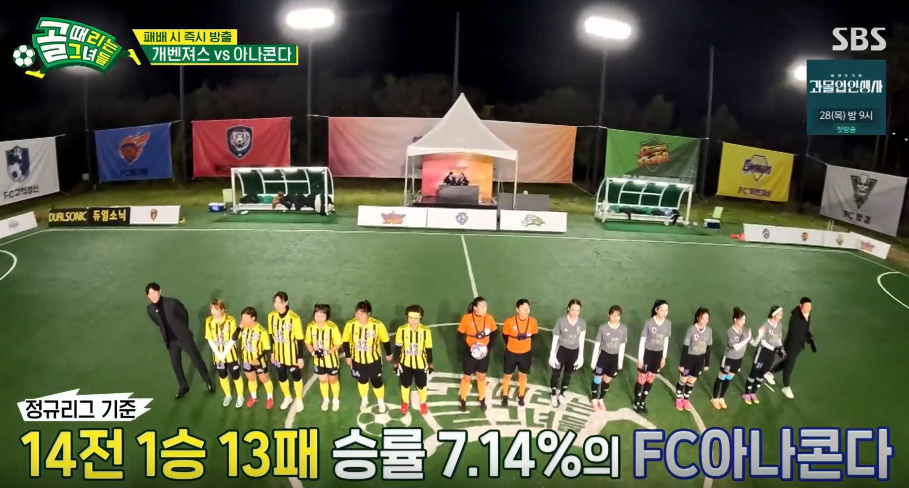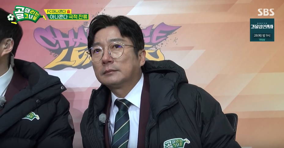 윤태진의 킥인이 수비벽에 맞고 골대를 맞은 후 조혜련의 몸에 맞고 들어갑니다.