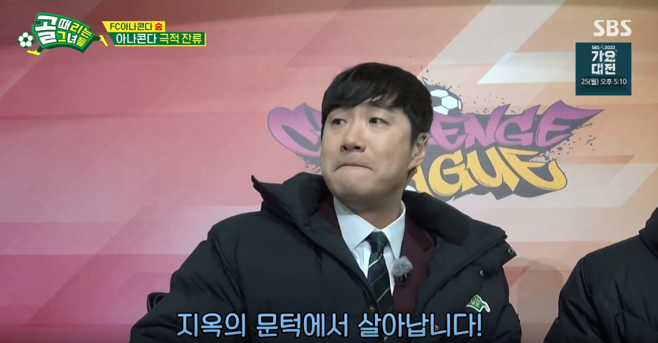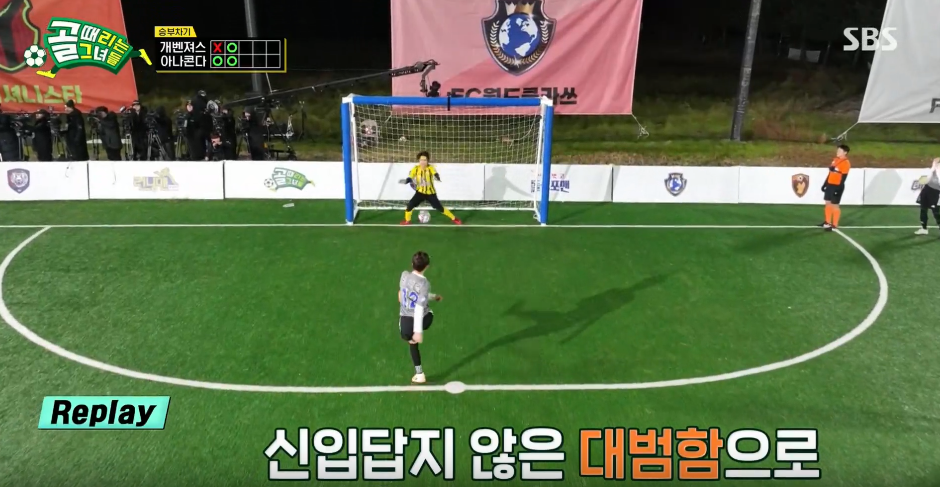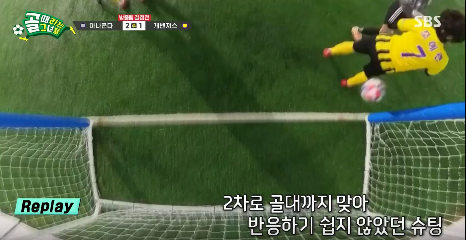 이나연은 골키퍼가 아주 쉽게 막을 수 있는 코스로 킥을 찼는데 조혜련의 다리 사이로 들어갔습니다.