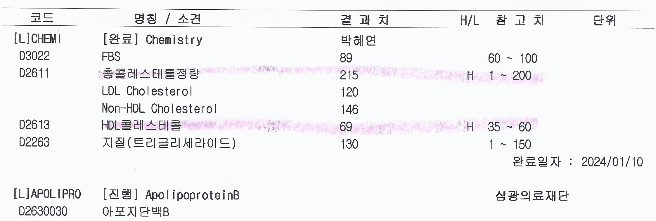 좋은 콜레스테롤 HDL 값은 69로 매우 좋은 값이고