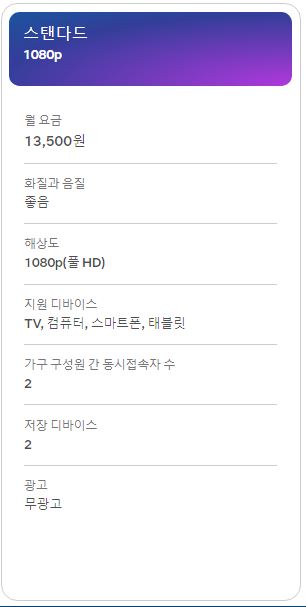 - 스탠다드 요금제 : 1080p 화질 , 2명 동시시청 가능
