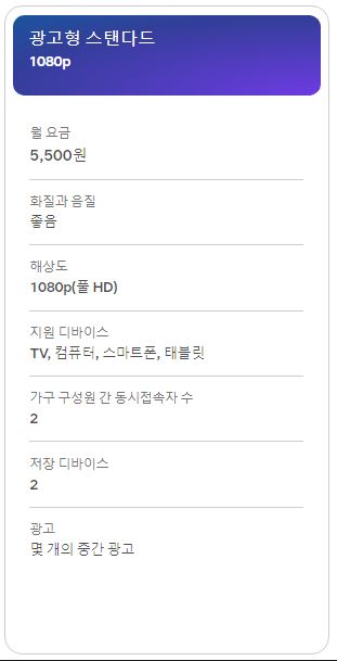 - 광고형 스탠다드 요금제 : 1080p 화질 , 2명 동시시청 가능 , 광고를 시청해야 함.