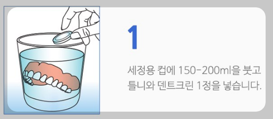 덴트크린의 사용방법을 보면 150~200ml 의 물에 덴트크린 1정을 사용하도록 설명되어 있습니다.