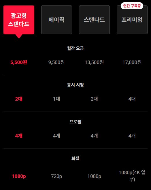 광고가 없는 요금제는 월 9,500원부터 시작하는데 9,500원짜리 베이직 요금제는 720p 의 화질만 지원하기 때문에 화질을 고려하면 13,500원 스탠다드 요금제 또는 17,000원 프리미엄 요금제를 고려해야 합니다.