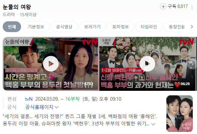 tvN 드라마 눈물의 여왕은 현재 티빙내 인기 순위 1위를 하고 있습니다.