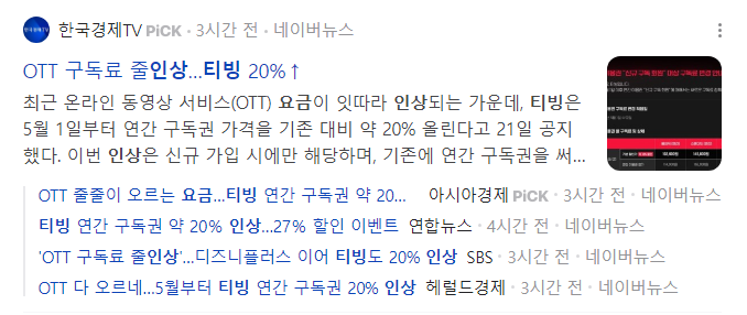 | 티빙 tving 요금 인상 2024년 5월 1일 . 연간이용료 오르기 전에 빨리 결제하세요. (0) | 2024.04.21 |