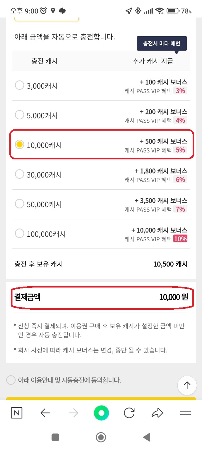 500캐시를 보너스로 주고 , 10,000원 뜨헉..