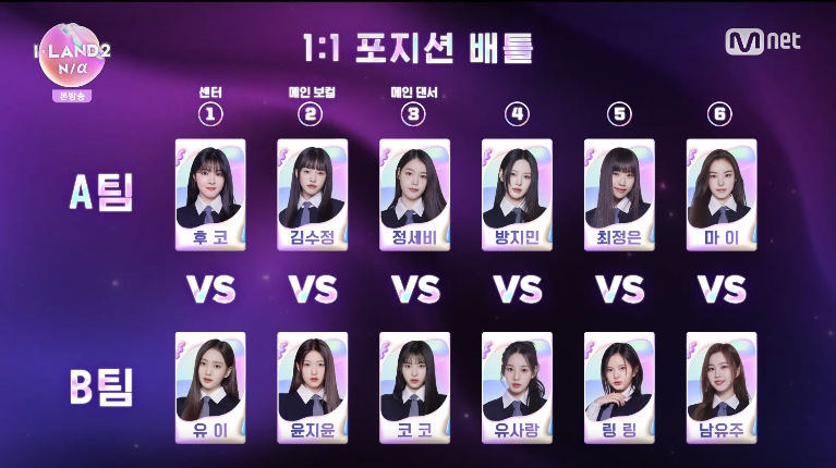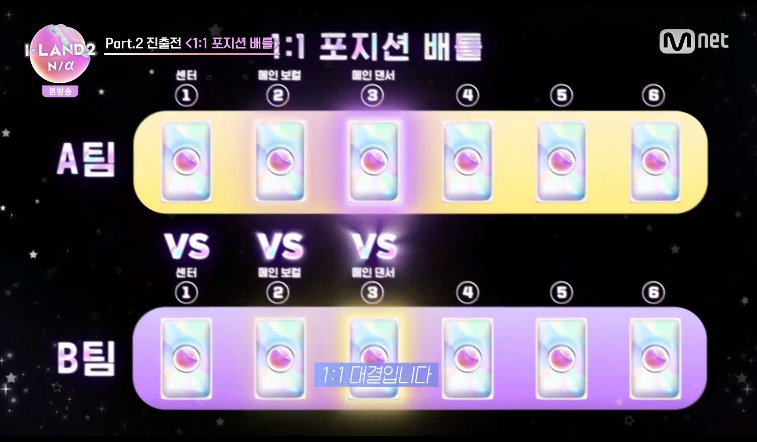 1:1 포지션 배틀은 그동안의 평가로 정해진 순위 순서로 자신이 원하는 팀과 포지션을 선택해서 상대팀의 같은 포지션과 대결을 하는 방식입니다.