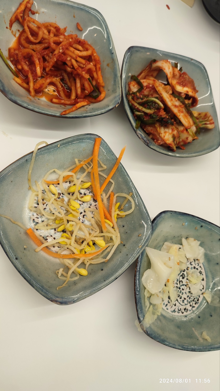 칼국수를 주문하면 보리밥과 무생채, 콩나물무침 , 양배추 , 김치 등이 나옵니다.