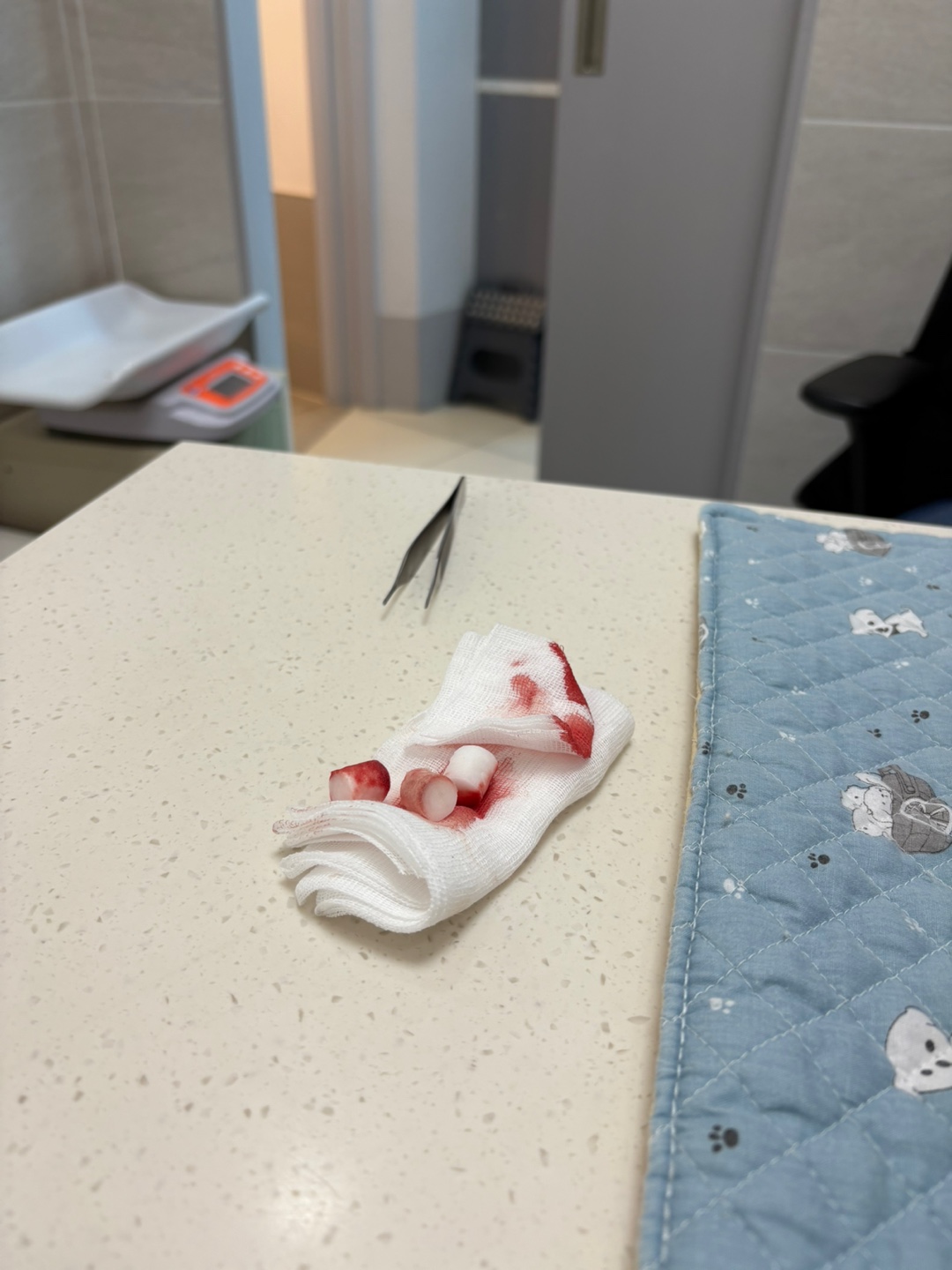 진료를 받으면서 또 흘러나온 피를 닦은 흔적이네요. ㅠㅠ