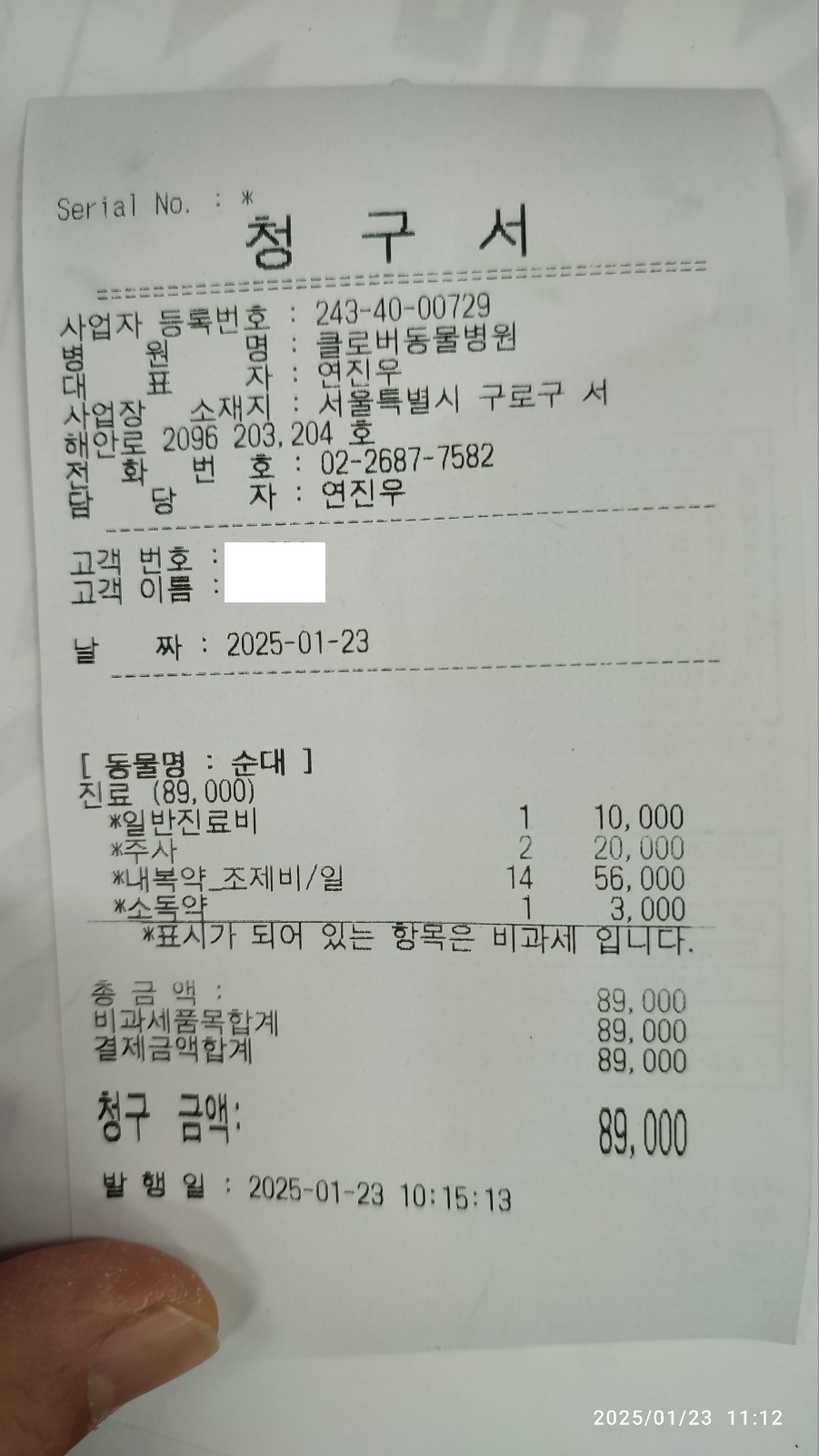 비용은 진료비 , 주사비 , 약값 , 소독약 으로 89,000원이 들었습니다.