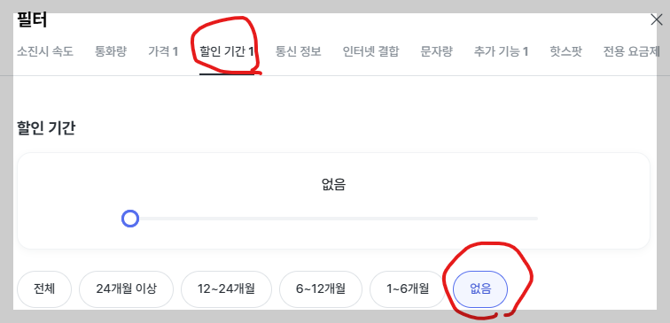 나는 귀찮으니까 한번 가입하면 쭉 사용하겠다 싶으면 할인기간을 없음을 선택하면 평생 이용할 수 있는 요금제들이 안내됩니다.