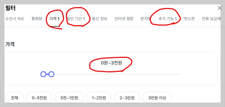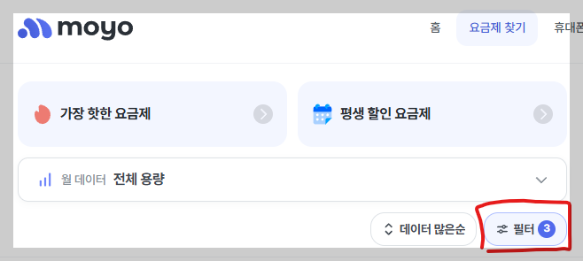 요금제찾기를 누른 후 필터를 선택합니다.