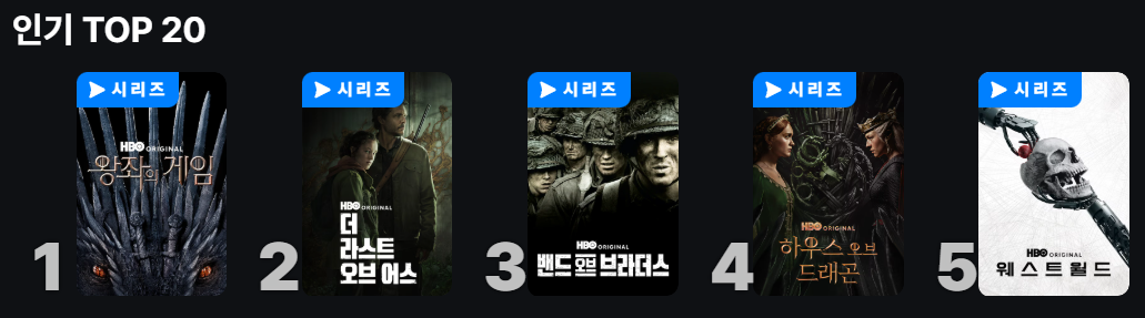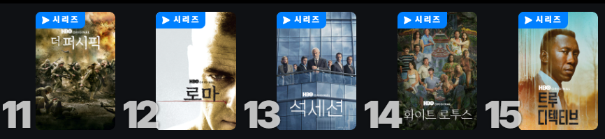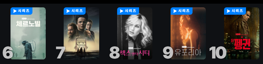 쿠팡에 공개된 HBO 작품들의 현재 인기순위입니다.