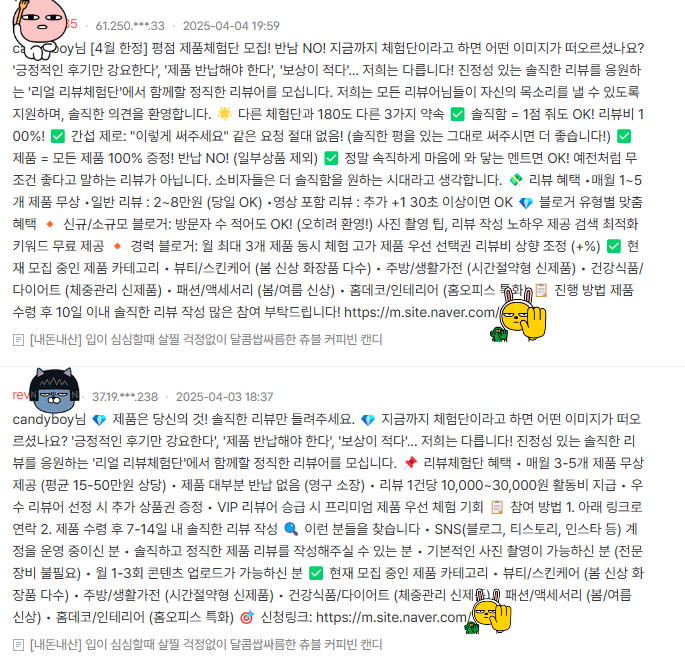 - 체험단 신청하지 않았음에도 모르는 번호 등으로 연락이 와 사기 시도, 이후 사이트가 갑자기 폐쇄되는 등 피해 발생.