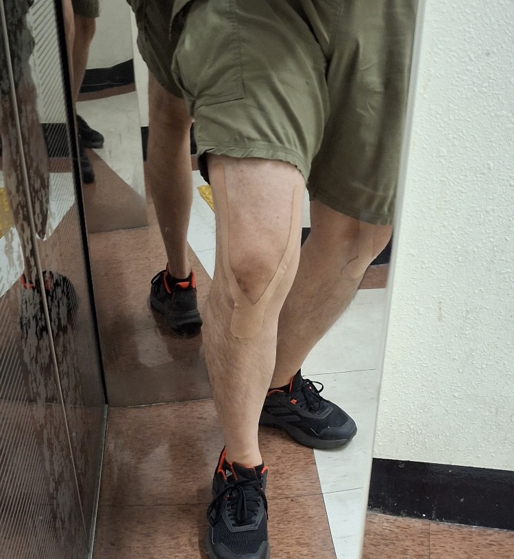 이러저러한 테스트를 하다가 가장 적은 양으로 효과를 보는 방법으로 테이핑을 한 것이고, 무릎이나 근육에 불편함이 있거나 강행군이 필요한 날에는 세배쯤 더 많은 양의 테이핑을 합니다. 즉, 이 사진은 "가성비 모드" 의 테이핑입니다. ㅎㅎ