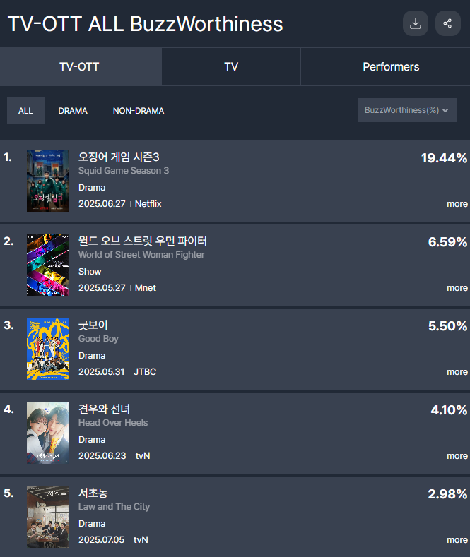 - 화제성 순위 확인: 매주 업데이트되는 TV-OTT 통합 화제성 순위를 통해 요즘 가장 인기 있는 프로그램이 무엇인지 한눈에 파악할 수 있어요.