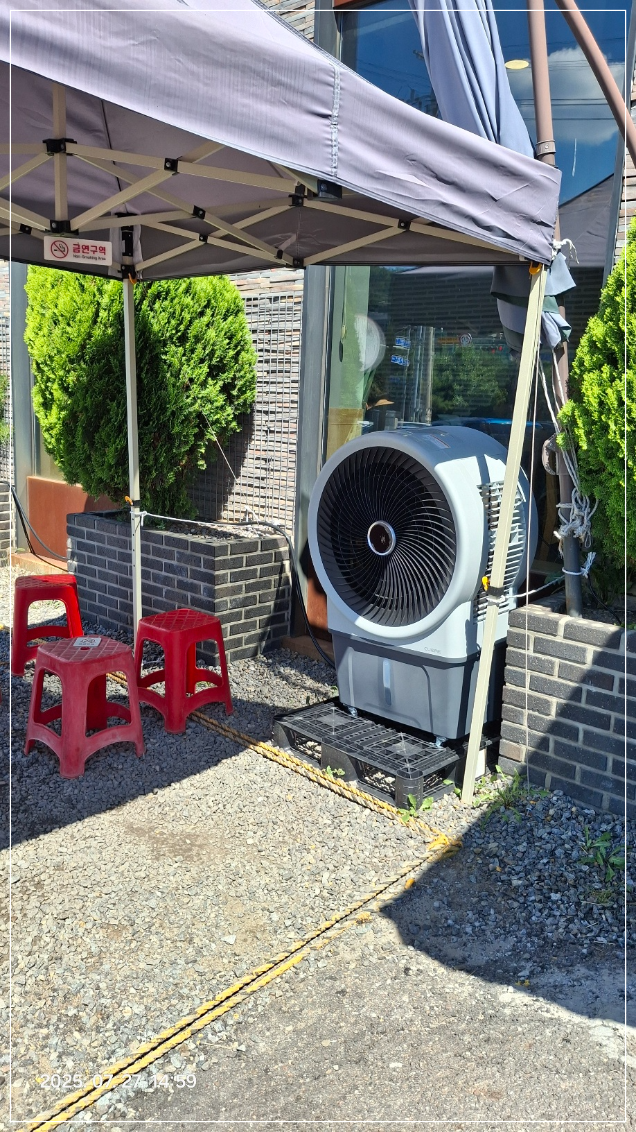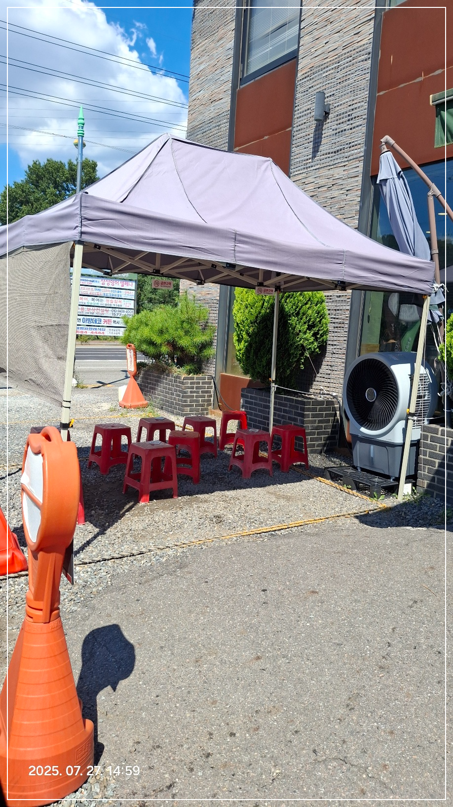 대형 ( 냉풍기였지만 지금은 그냥 ) 선풍기가 돌아가는 천막 아래에서 대략 10분 정도 앉아 있었는데 오늘 낮기온은 약 38도입니다. ㅎㅎ